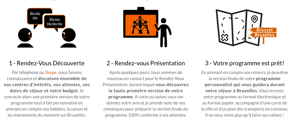 3) Plaisir – Votre programme sur-mesure est prêt ! Il vous est envoyé au format électronique et papier avec des cartes de la ville et des transports en commun. Il ne vous reste plus qu’à faire votre valise et profiter de Bruxelles.