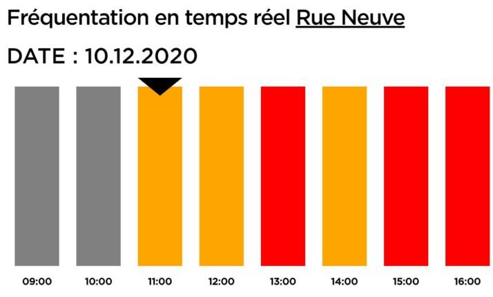 Les visiteurs peuvent y accéder par les rues perpendiculaires. Outre le rappel des mesures sanitaires en vigueur (port du masque obligatoire; respect de la distanciation physique; faire ses courses seul(e) durant maximum 30 minutes), les jours et heures de plus grande affluence y sont clairement renseignés. L’objectif est de mettre en évidence les jours les moins congestionnés, à savoir les lundi, mardi, mercredi matin, jeudi et vendredi matin. La Ville rappelle que durant le mois de décembre, les magasins de la rue Neuve ouvriront aussi leurs portes le dimanche, ce qui permettra de diluer davantage la fréquentation. En parallèle au nouveau site internet, des écrans installés à divers endroits donnant accès à la rue diffusent en temps réel les mêmes codes couleur pour que les visiteurs puissent organiser au mieux leurs déplacements.