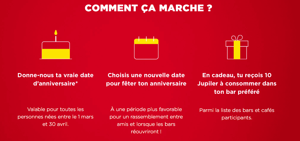 Afin de vous soutenir vous et vos cafés préférés, Jupiler vous a réservé une surprise! Vous allez pouvoir recevoir gratuitement 10 pintjes Jupiler ( et/ou Jupiler 0,0%) à déguster dans ton bar préféré de la capitale. Vous pourrez donc de cette manière, sagement reporter à plus tard la date de votre anniversaire et le fêter dignement avec vos amis à Bruxelles.