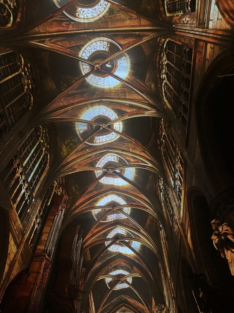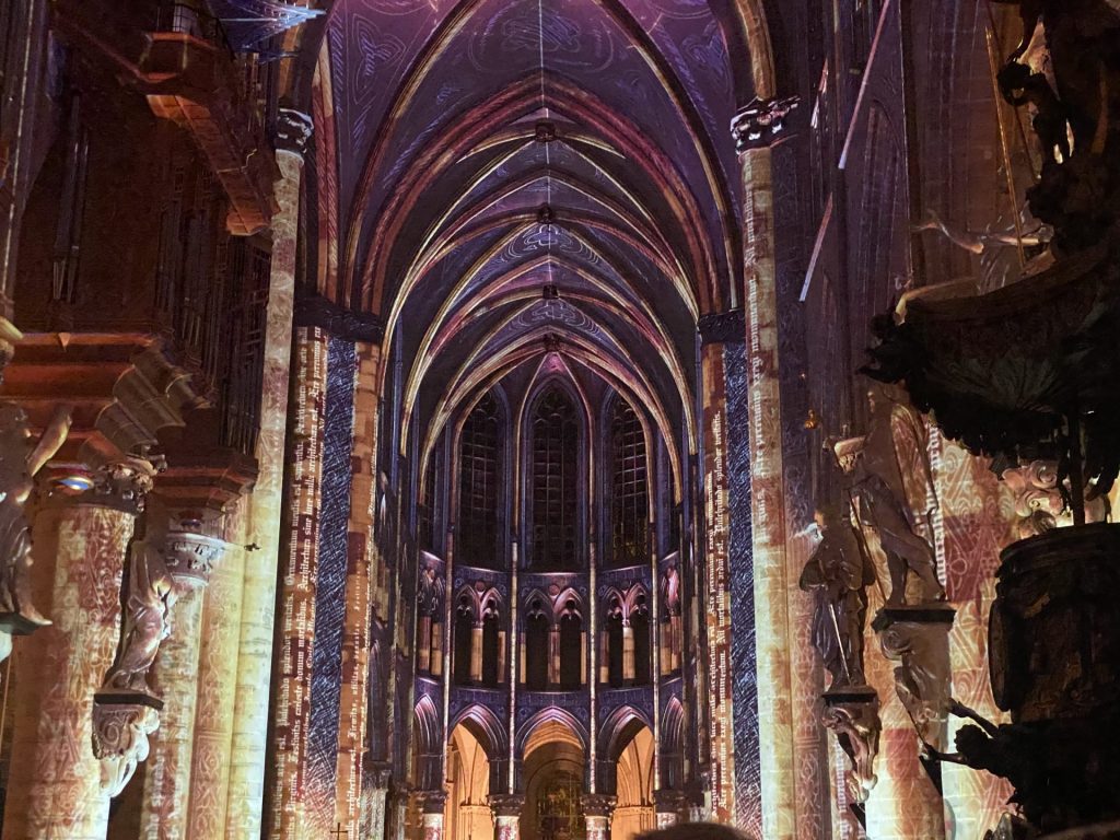 Grâce à une modélisation 3D intégrale de l’édifice, chaque projection épouse parfaitement les pierres, colonnes, voûtes et vitraux. Le vidéo mapping transforme l’espace en une fresque vivante, retraçant l’histoire du lieu et révélant ses secrets.