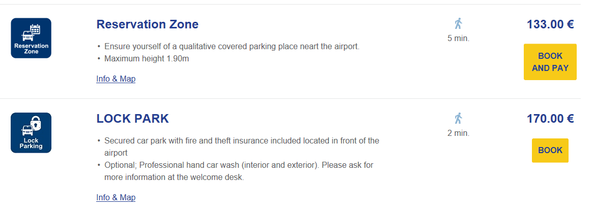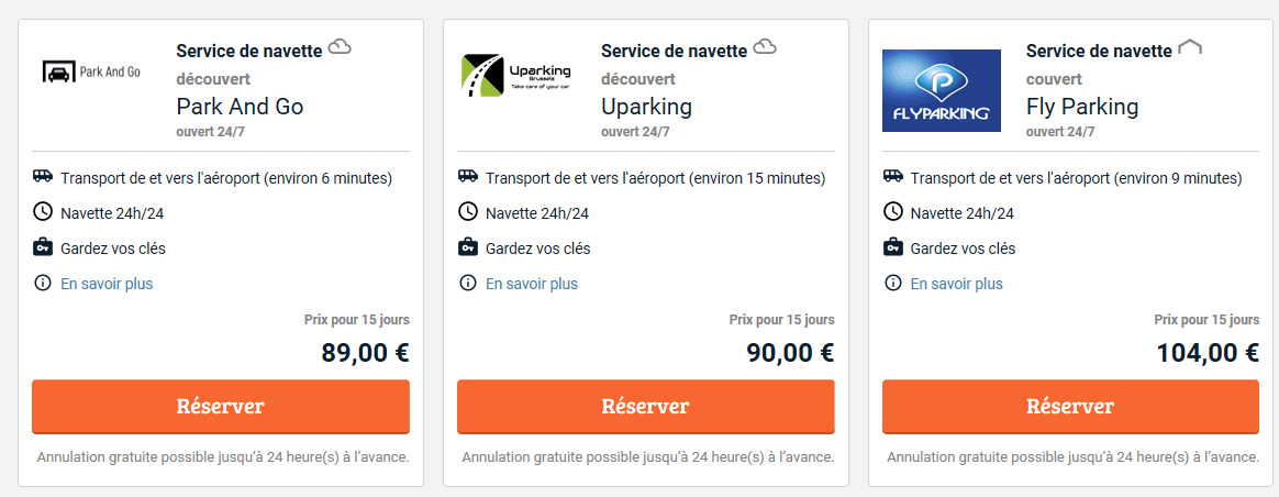 Ce site vous laisse le choix entre différents parkings qui se situent près de Brussels Airport.Lors de notre test. le parking le moins cher revenait à 89,00 € avec Aéropark 1000, un service de navettes disponible 24 heures sur 24. Un autre système de navette, revenait quant à lui 105 euros, Brussels Airport Express Parking. Le plus cher coutait 120 euros (SKY Parking). Interparking Lock parking revennait lui a 170euros et VIP 207 euros.